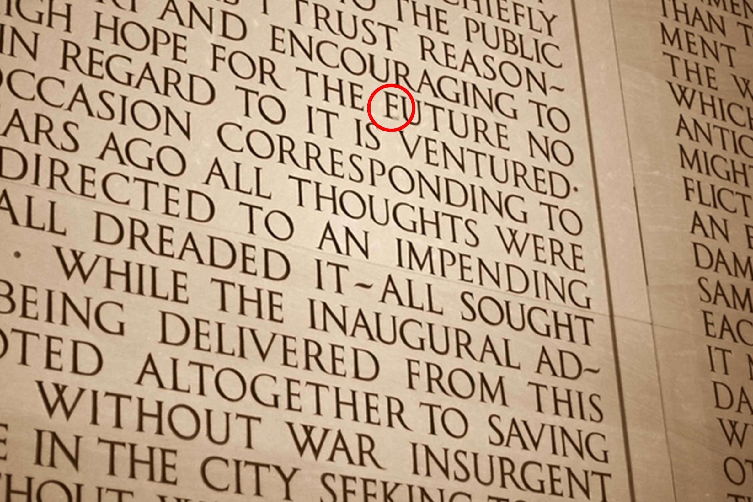 Except, not in the Lincoln Memorial. To hear the engraver tell it, Lincoln was more concerned with his “high hope for the euture.” Visit the Memorial today and you can still see where the bottom of the “E” in “EUTURE” was eventually filled in with slightly off-colored stone to become “FUTURE,” more or less.