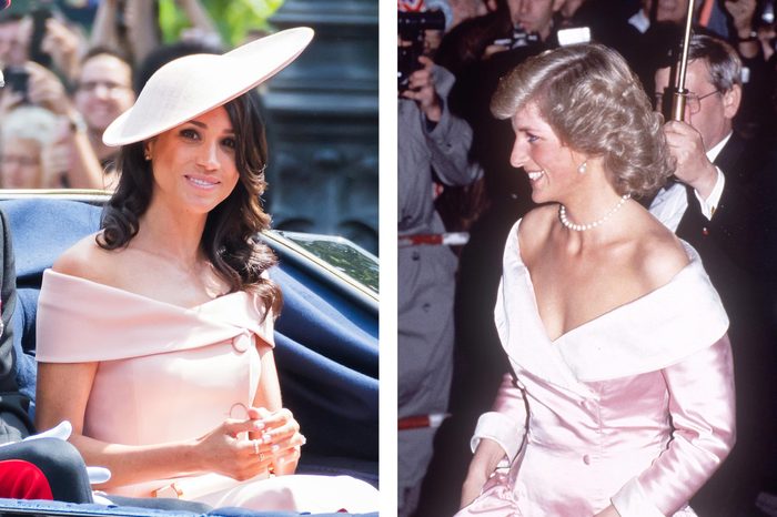 Many people were shocked to see Meghan Markle wearing an off-the-shoulder gown at this year’s Trooping the Colour, but she wasn’t breaking royal protocol. In fact, Princess Diana wore a similar pink, off-the-shoulder dress back in 1987.