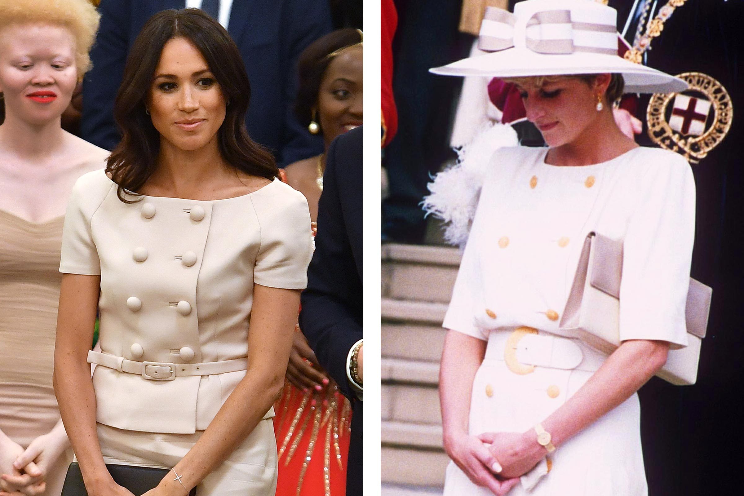 Even though Princess Diana chose to wear a hat, she looks almost identical to Meghan Markle. Both dresses are cream-colored, have buttons down the front, and a belt at the waist.